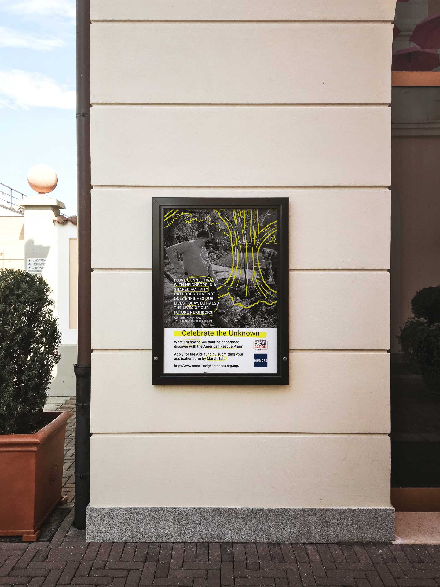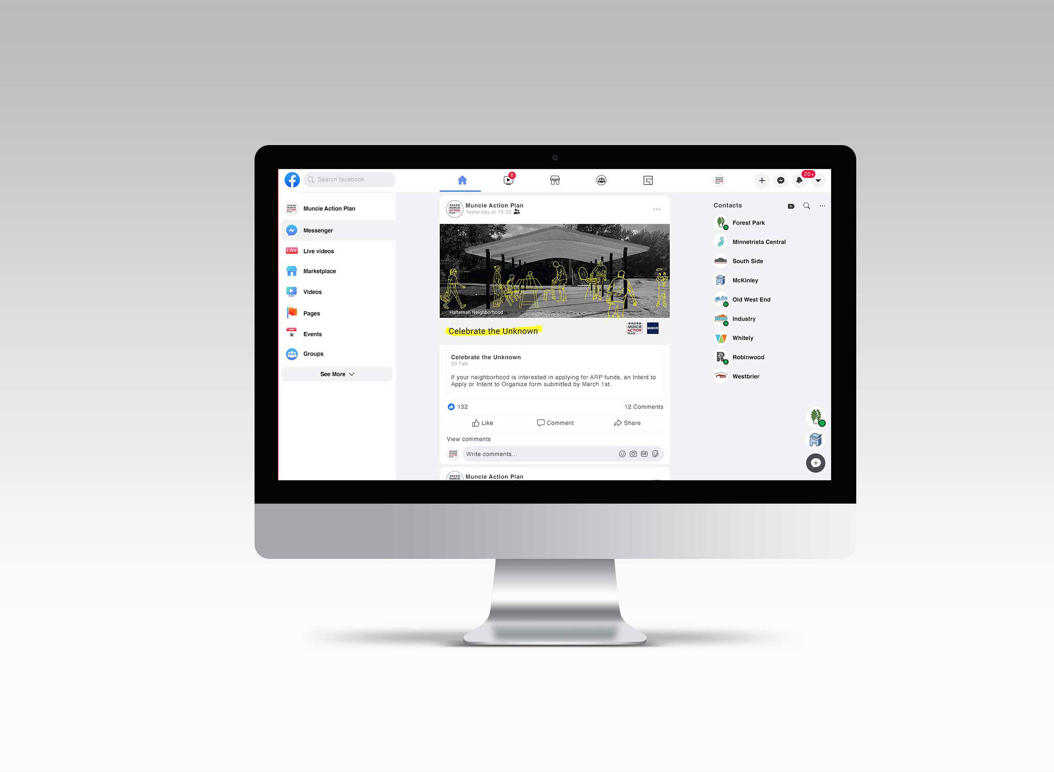 During my time as project manager at Studio 165+ our client, Building Better Neighborhoods (BBN) commisioned us to create posts to generate awareness about funding available to Muncie neighborhoods. The concept was based on “highlighting the unknown” and showcasing what neighborhoods have been doing to improve with grant money. My team created posts for multiple Munice neighborhoods that were to be posted on both Instagram and Facebook. This was a completely hands on experience that included creating and drafting concepts, editing images, drawing illustrations and coming up with a visually impactful final product.