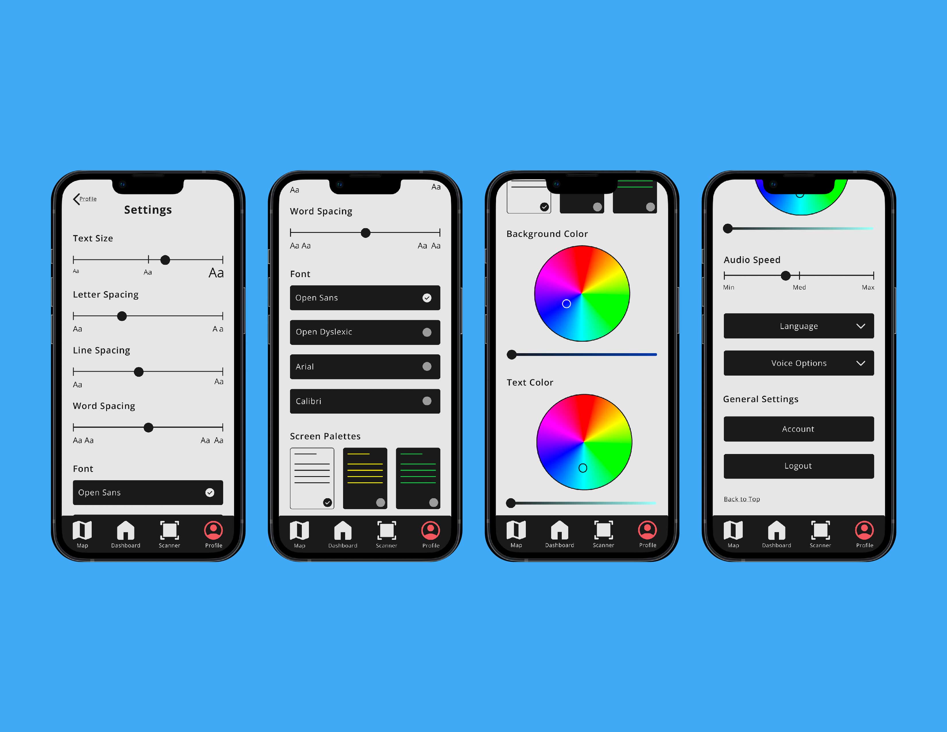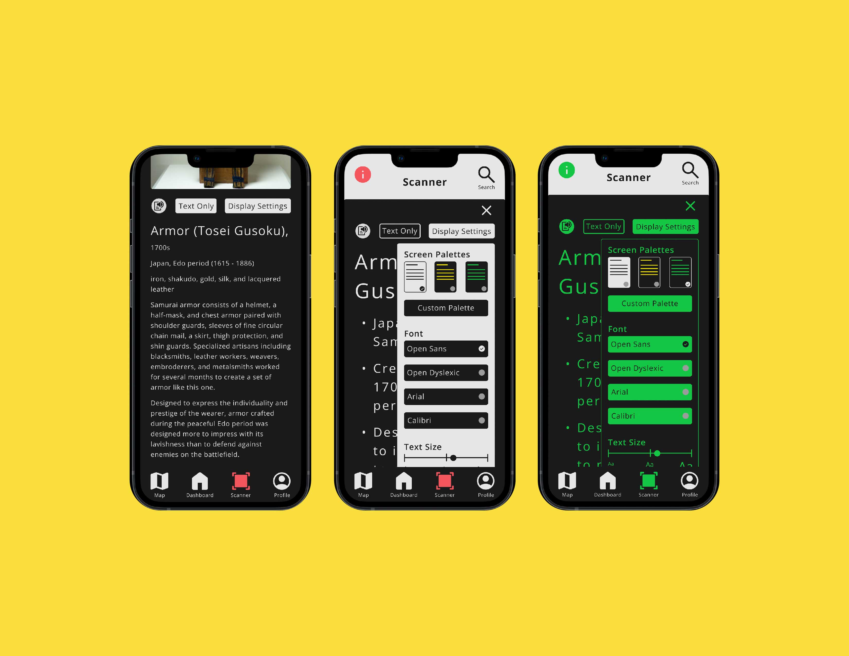 Guided DOMA is a concept app made for the David Owsley Museum of Art at Ball State University. The goal was to focus on accessibility and create an app that helps with the museum expereience for people with disabilities. I chose to focus on people who have dyslexia and/or general vision loss when coming up with the features for this app. These features included a map, an audio tour section, and a scanner feature. With all of this the user can also find information about all of the galleries, upcoming exhibitions, and DOMA itself. When creating Guided DOMA I went to the museum to take my own photographs used within the app as well as illustrating and animating my splash and onboarding screens. I worked in Figma to build the layout and prototype the pages.